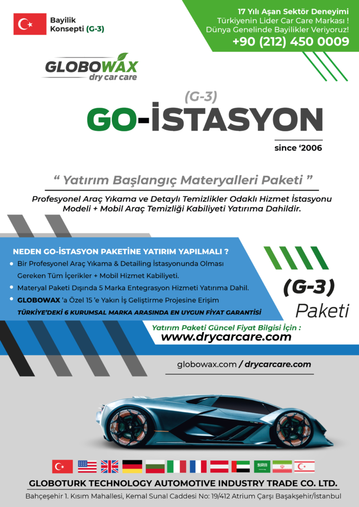 (1) drycarcare , (2) car wash ve (3) steam wash konseptleri GLOBOWAX markasının üç ayrı hizmet kabiliyetidir. – Dry Car Care Türkiye.